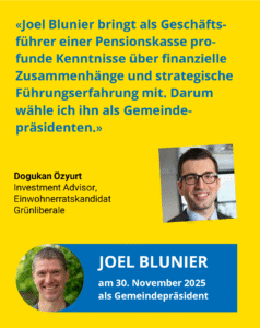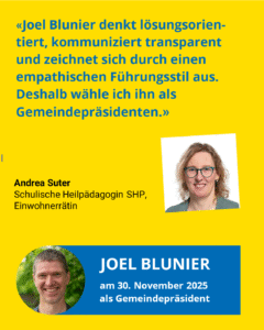 Herzlichen Dank für die Wiederwahl in den Gemeinderat. Ich freue mich über das beste Wahlresultat aller Kandidierenden und das damit entgegengebrachte Vertrauen. Auch bei der Wahl als Gemeindepräsident habe ich die meisten Stimmen erhalten, das absolute Mehr wurde aber von keinem Kandidaten erreicht, so dass es am 30. November 2025 zu einem zweiten Wahlgang kommt.