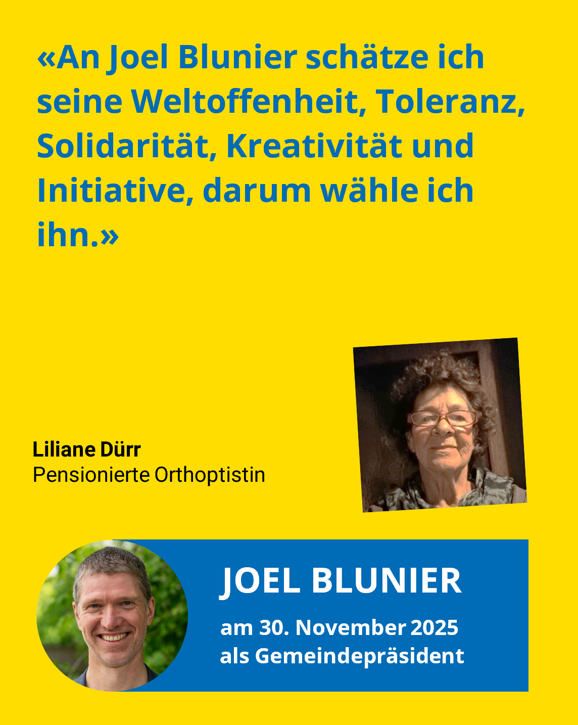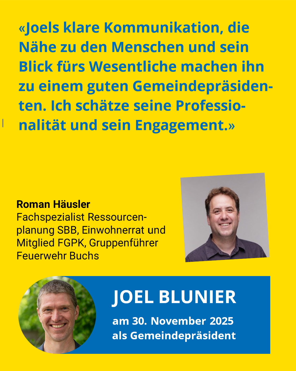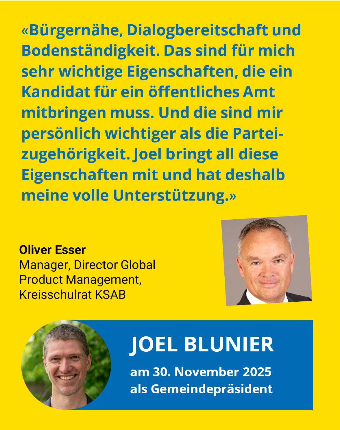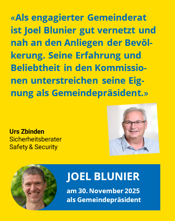 Herzlichen Dank für die Wiederwahl in den Gemeinderat. Ich freue mich über das beste Wahlresultat aller Kandidierenden und das damit entgegengebrachte Vertrauen. Auch bei der Wahl als Gemeindepräsident habe ich die meisten Stimmen erhalten, das absolute Mehr wurde aber von keinem Kandidaten erreicht, so dass es am 30. November 2025 zu einem zweiten Wahlgang kommt.
