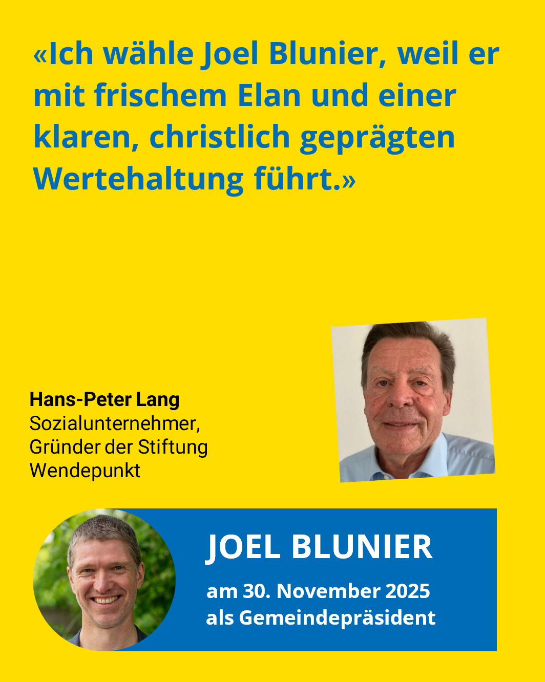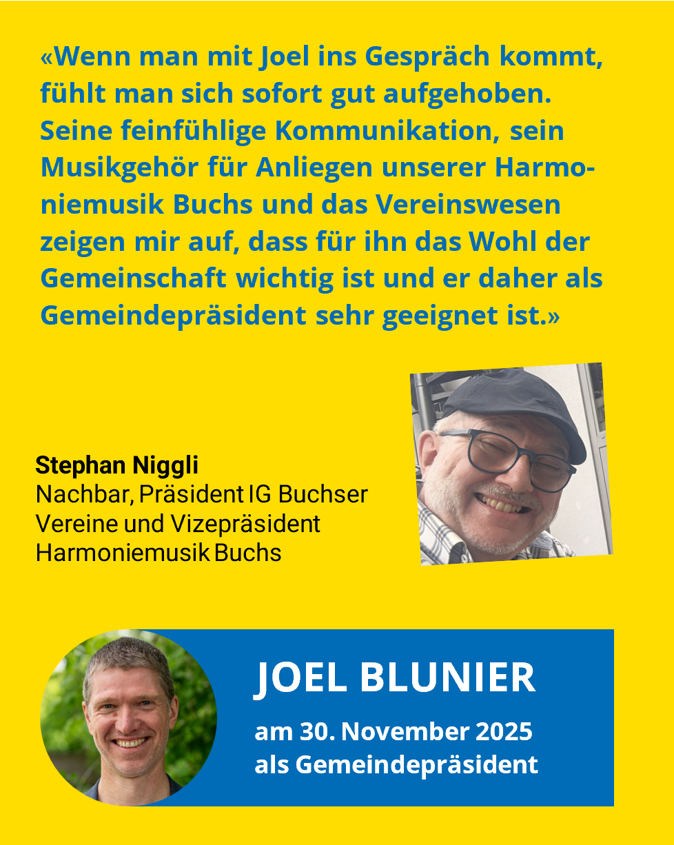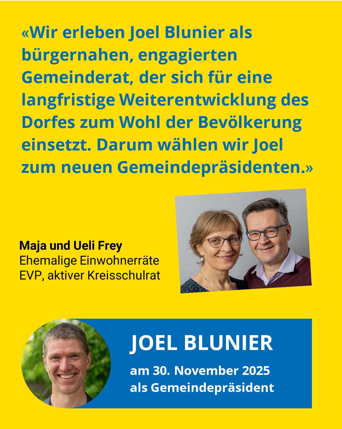Herzlichen Dank für die Wiederwahl in den Gemeinderat. Ich freue mich über das beste Wahlresultat aller Kandidierenden und das damit entgegengebrachte Vertrauen. Auch bei der Wahl als Gemeindepräsident habe ich die meisten Stimmen erhalten, das absolute Mehr wurde aber von keinem Kandidaten erreicht, so dass es am 30. November 2025 zu einem zweiten Wahlgang kommt.